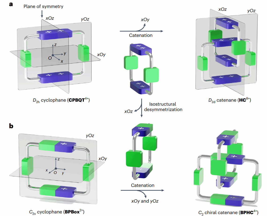 研究团队设计了一种新型索烃分子(BPHC4+),由两个非手性的环(BPBox2+)通过机械互锁形成。BPBox2+环通过替换原有环(CBPQT4+)中的双阳离子双吡啶单元为单阳离子苯基-吡啶单元,降低了分子对称性(从D2h降至C2v),从而失去一个对称平面(xOz)。这种等结构去对称化策略使得两个BPBox2+环在互锁后形成紧凑的构象,失去所有对称平面,仅保留一个C2对称轴,从而产生手性(图1b)。相比之下,基于CBPQT4+的母体索烃分子(HC8+)因保留两个对称平面而保持非手性(图1a)。