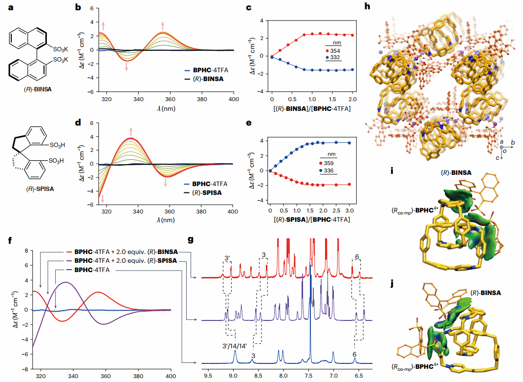 手性诱导实验(图3)进一步展示了BPHC4+手性的可调性。在外消旋状态下,BPHC4+无光学活性。加入手性二磺酸盐(如(R)-BINSA或(R)-SPISA)后,圆二色谱(CD)信号出现,表明诱导手性的产生。例如,添加(R)-BINSA后,CD信号在332 nm和354 nm处分别显示负和正Cotton效应,饱和非对映异构体过量(d.e.)达18%(图3c)。与(R)-SPISA的实验显示11%的d.e.(图3e)。1H NMR(图3g)确认了两种非对映异构体((Sco-mp)-BPHC-(R)-BINSA和(Rco-mp)-BPHC-(R)-BINSA)的形成。固态中,BPHC4+与(R)-BINSA共结晶仅生成单一非对映异构体((Rco-mp)-BPHC-(R)-BINSA,图3h),归因于范德瓦尔斯和静电相互作用(图3i,j)。同时研究团队也发现,索烃分子相较于其环状拓扑异构体具有显著增强的细胞穿透能力,表明分子拓扑效应在应用方面具有广阔的前景。