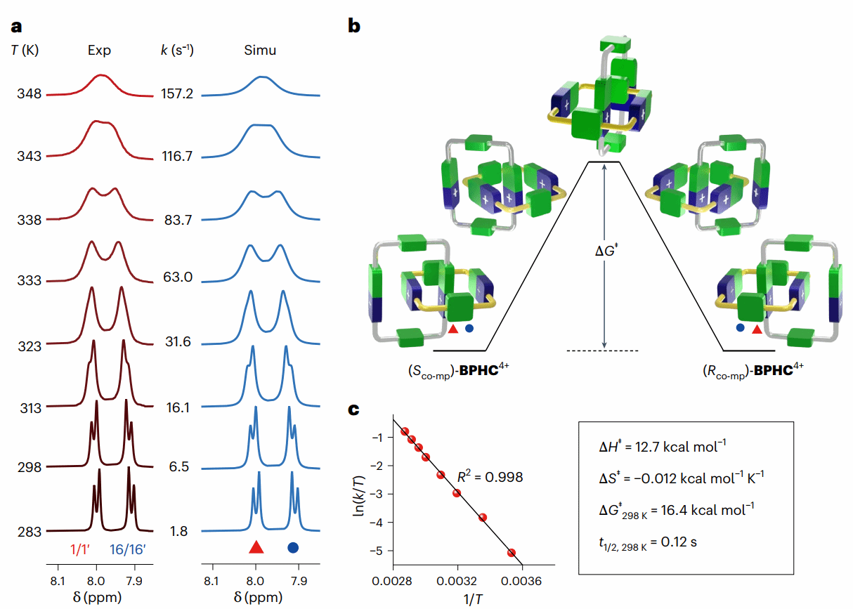 BPHC4+的机械手性源于其紧凑构象中两个环的特定相对取向,从而产生一对对映异构体(Rco-mp和Sco-mp)。图2a的变温NMR实验显示,两个环之间的“旋转”运动(pirouetting,图2b)导致对映异构体之间的互变,即外消旋化。具体而言,质子信号H-1/1’和H-16/16’在低温时分化为两组,反映了对映异构体的不同化学环境;随着温度升高,旋转运动加速,信号合并,表明对映异构体快速互变,产生外消旋化(图2)。通过对NMR谱峰形状的拟合(图2a右侧),研究团队获得了不同温度下的互变速率常数(k),并利用Eyring方程(图2c)拟合得到外消旋化的吉布斯自由能垒(ΔG)为16.4 kcal mol–1。这一能垒表明BPHC4+在室温下表现出双稳态的构象分布,手性状态可在一定条件下保持,并可实现对映异构体的相互转换能力,从而实现机械手性的调控。这种动态行为是可调控的唯构象依赖机械手性的核心特征。