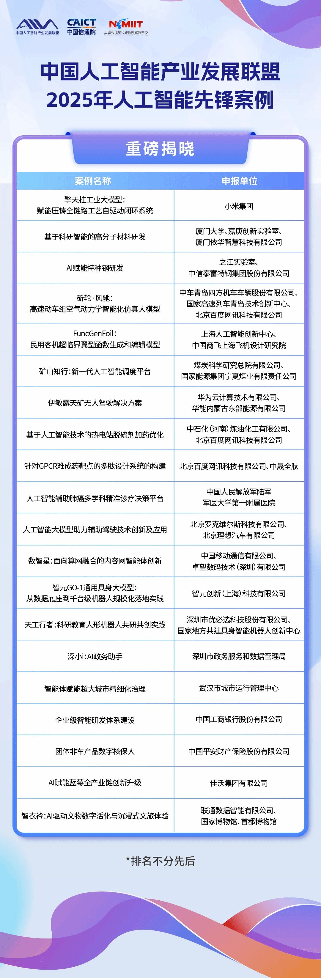 为深入贯彻总书记重要论述,落实国家行动部署,更好地推动我国人工智能技术应用及产业发展,中国人工智能产业发展联盟联合工业和信息化部新闻宣传中心、中国信息通信研究院面向全球共同组织开展2025年(第三届)AIIA人工智能先锋案例征集,甄选并推广一批具有技术前瞻性、实践先进性和行业标杆性的“AI+”优秀实践。
